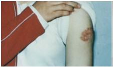 赵某,18岁,属于打预防针后留下的疤痕疙瘩,颜色鲜红,疼痒,突出正常皮肤且随着时间的推移慢慢长大,属于典型的疤痕体质,做过一次手术,患处生长更大,于05年来我院治疗,四个疗程后疙瘩变平,患处变软,颜色接近正常皮肤治疗。